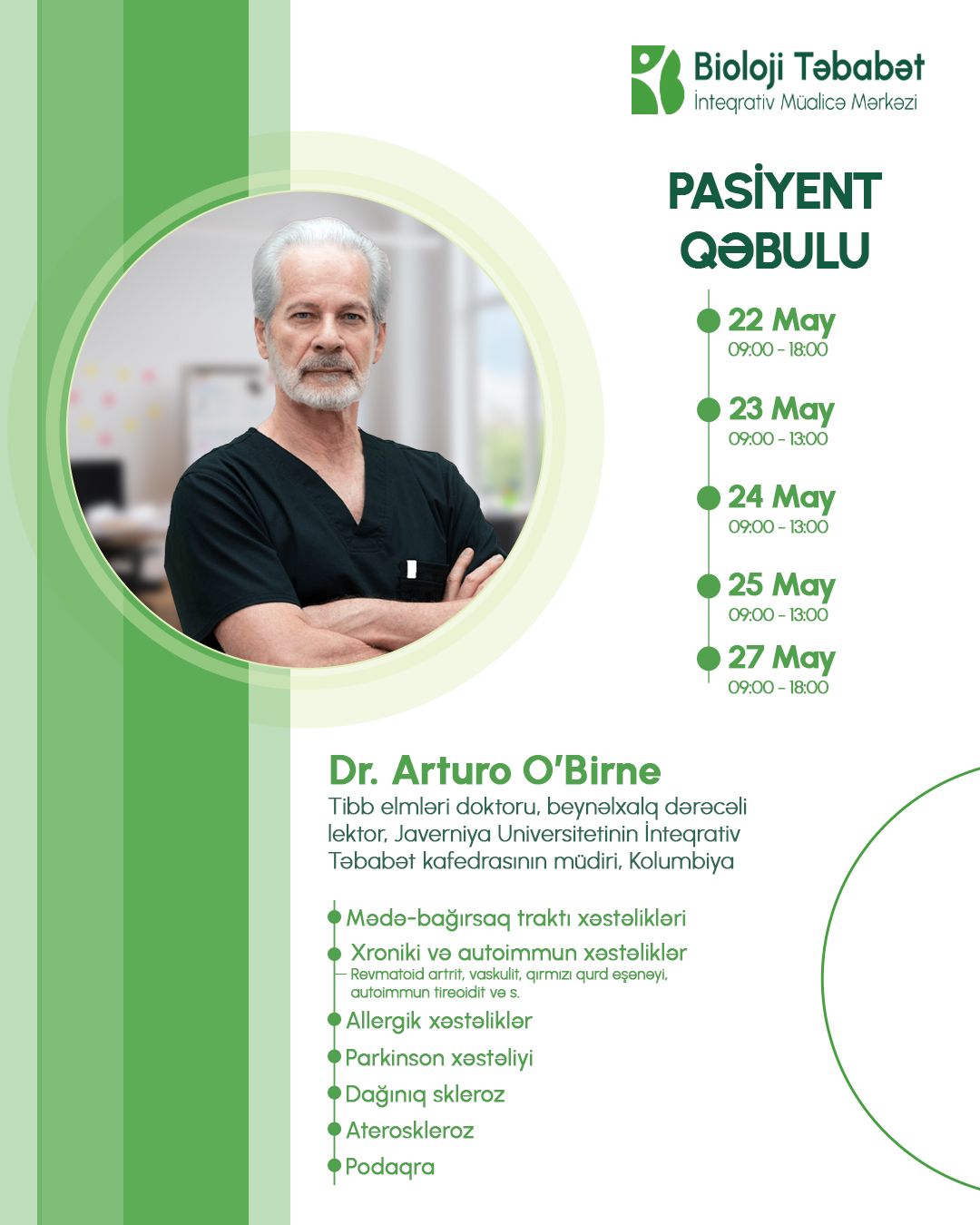 Dr. Arturonun Azərbaycana səfərinin məqsədi təkcə seminarla bağlı deyil.O, seminardan sonrakı günlərdə- mayın 22-dən 27-nə qədər Bioloji Təbabət İnteqrativ Müalicə Mərkəzində pasient qəbulu həyata keçirəcək.Mədə-bağırsaq traktı xəstəliklərindən,parkinson, dağınıq skleroz, padaqra, ateroskleroz xəstəliyindən əziyyət çəkənlər İnteqrativ Müalicə Mərkəzində qeydiyyatdan keçə bilərlər.Qeyd edilən günlərdə allergik xəstəliklərlə yanaşı revmatoid artrit, qırmızı qurd eşənəyi, vaskulit problemi olan xəstələr də xroniki və autoimmun xəstəliklərin müalicəsində uzun müddətli təcrübəyə malik professor O`Birneyə müraciət edə bilərlər.